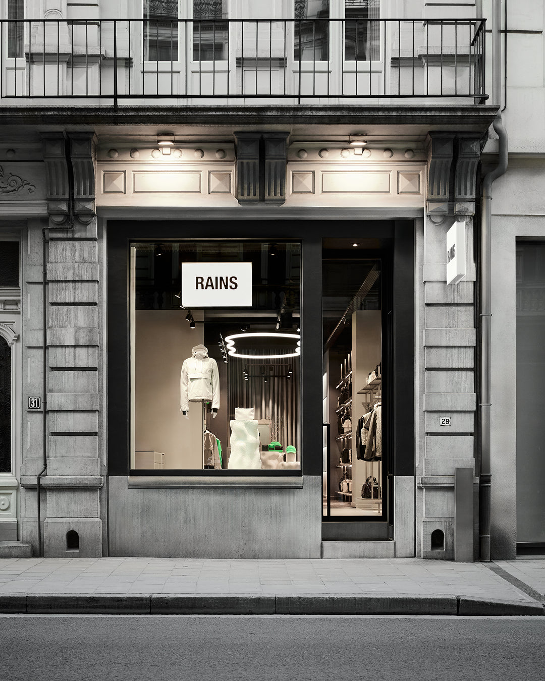 Rains brings its signature conceptual approach into the design of this space in the heart of Brussels. Hanging above the store is a custom-designed light fixture — a cloud-like sculpture that adapts its light to match the city’s ever-changing weather. A thoughtful detail that speaks to our legacy as an all-weather brand.